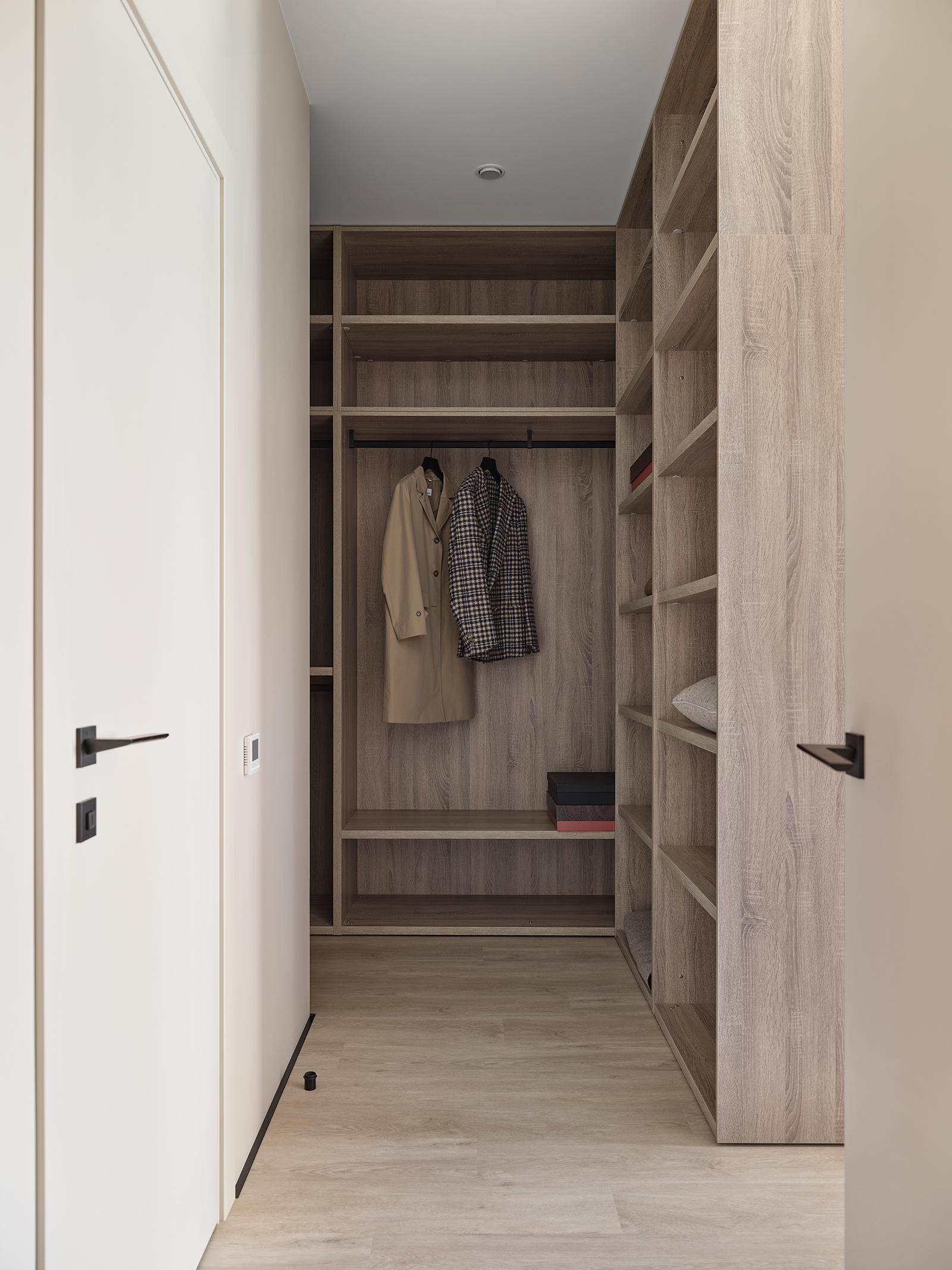 The walk-in closet itself is simple, without drawers or lighting. We designed it to fit the customer's budget. It is spacious: it reaches the very ceiling, and we extended the rods deep into the closets. This provides ample storage space for out-of-season clothes.