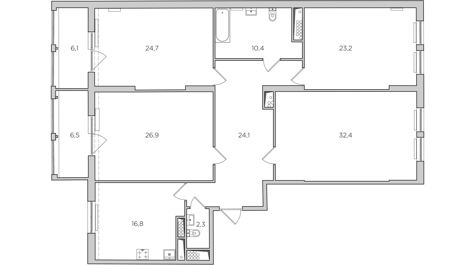Features Passing thought hallway, small guest bathroom, separate kitchen and living room, large corridor, load-bearing pylons forming bedrooms